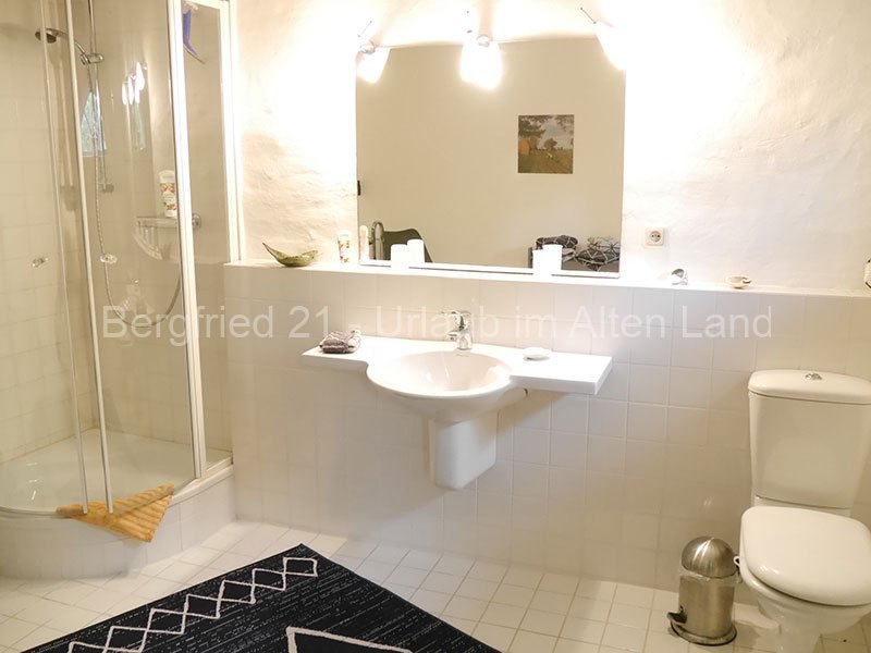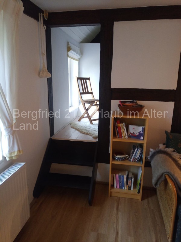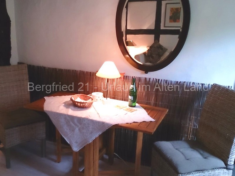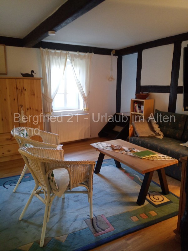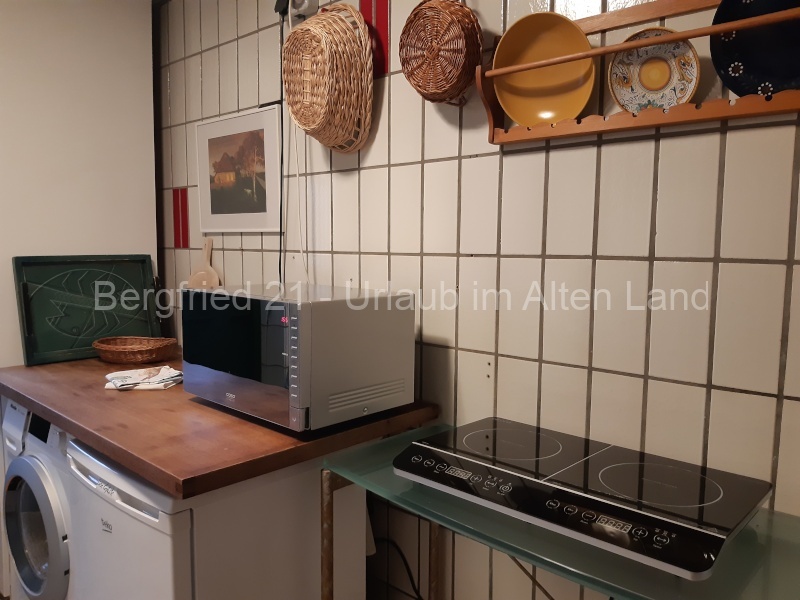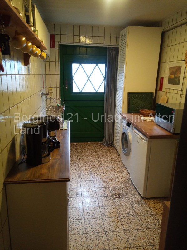 In der gemütlichen Wohnung finden Sie auf ca. 45qm ein Wohnzimmer mit einem Essplatz, einer Sitzecke mit ausziehbarer Doppelcouch sowie einer Fernsehanlage. Ein Futonbett für 2 Personen steht im angrenzenden Schlafraum und ein großzügiges Bad mit Dusche vervollständigt das Wohnensemble. Verlassen Sie die Wohnung zum ehemaligen Stall (der die hintere Hälfte des großen Hauses einnimmt) und durchqueren diese bäuerliche Stall-Diele, finden Sie eine kleine Küche mit Allem, was Sie zur Zubereitung Ihrer Mahlzeiten benötigen: 2-Platten-Induktionsherd, Kaffeemaschine, Wasserkocher, Mikrowelle, Toaster, verschiedene Küchenutensilien sowie Geschirr.